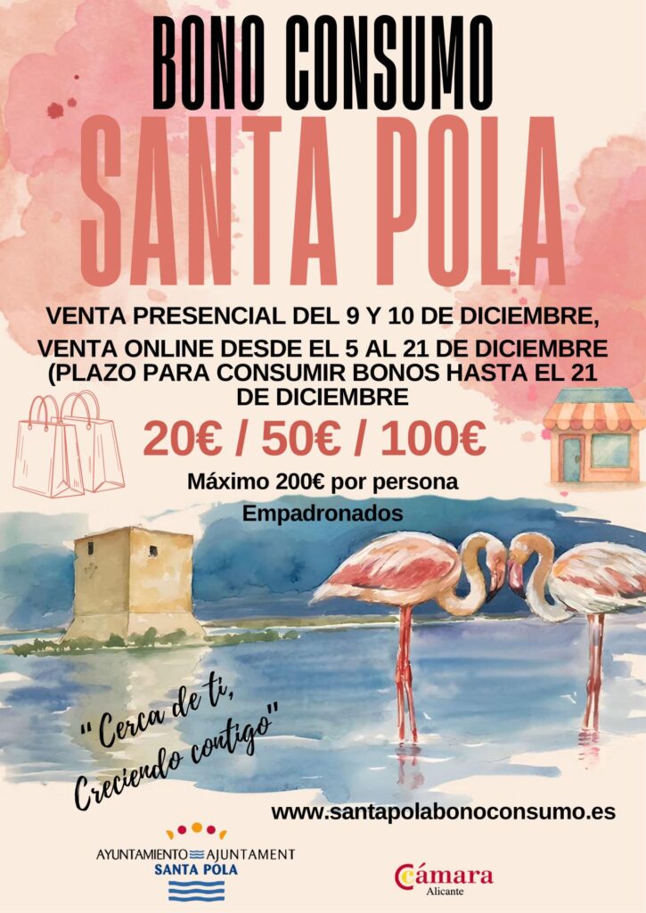 El Ayuntamiento de Santa Pola invierte 500.000 euros en esta campaña que dinamizará el comercio y la hostelería local hasta el 21 de diciembre Las personas mayores de edad y empadronadas en el municipio podrán adquirir hasta 200 euros en bonos, de los cuales pagarán solo la mitad A partir del día 5 a las […]