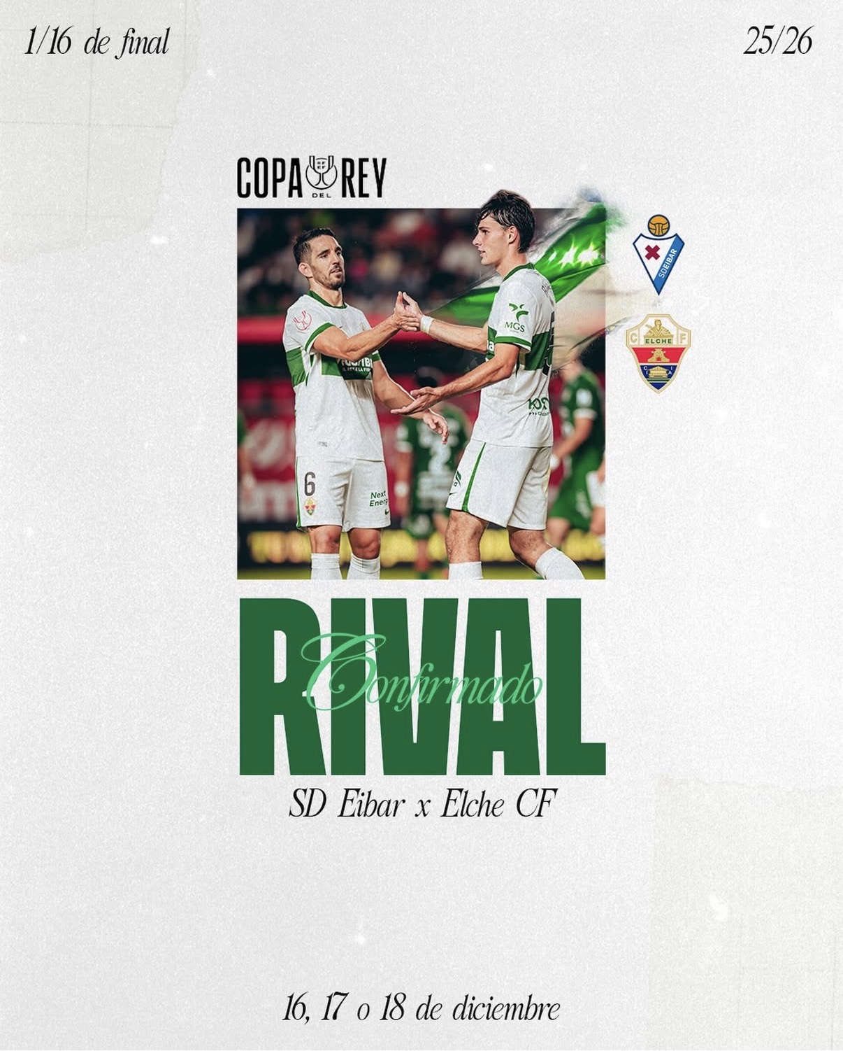 El Elche ya conoce cual será su rival para los dieciseisavos de final de Copa del Rey: la SD Eibar. Así lo ha dictaminado el sorteo celebrado este martes al mediodía en la sede de la RFEF, que ha emparejado al conjunto franjiverde con el equipo armero en una eliminatoria a partido único que se disputará en Ipurúa. El encuentro tendrá lugar la próxima semana entre los días 16, 17 o 18 de diciembre. El Eibar, equipo de Segunda División, se volverá a ver las caras ante un Elche que busca mantener el sueño de la Copa vivo una ronda más. Esta temporada, el conjunto dirigido por Beñat San José ha sumado 15 de sus 17 puntos como local.