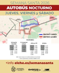 El autobús hace el recorrido entre los barrios de Altabix y Carrus con una frecuencia aproximada de 35 minutos. En cuanto a la movilidad a la zona de l’Aljub, habrá autobuses hasta la 1:15.