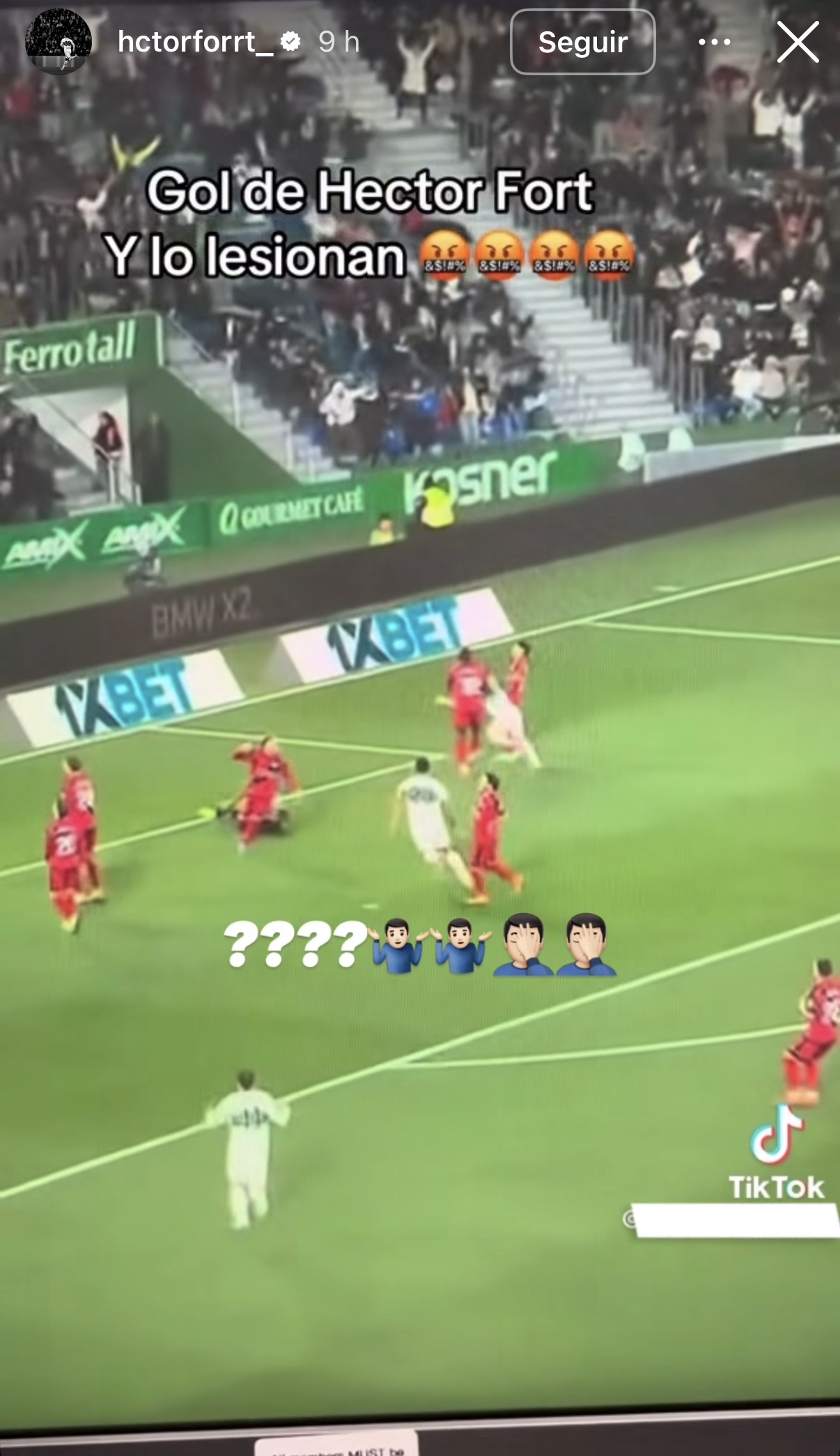La controversia en torno a la jugada no ha quedado solo en el partido. El propio Héctor Fort ha querido expresar su frustración a través de su cuenta de Instagram, donde ha compartido un vídeo de la acción analizada en cámara lenta. En una publicación cargada de simbolismo y malestar, el lateral acompañó las imágenes con cuatro interrogantes y varios emoticonos que reflejaban incredulidad ante lo ocurrido. Este gesto del futbolista catalán refleja su desconcierto por la jugada, una acción que no solo le privó de celebrar su primer gol en liga, sino que ha generado un clima de indignación entre la afición franjiverde por las graves consecuencias físicas.