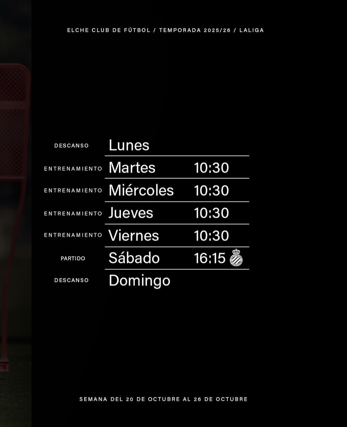 El Elche regresa este martes 21 de octubre a los entrenamientos en el Díez Iborra para comenzar a preparar el próximo duelo liguero de este sábado ante el RCD Espanyol, que se disputará a las 16:15 horas en el RCDE Stadium. Tras el empate sin goles frente al Athletic Club, el conjunto franjiverde quiere mantener las buenas sensaciones mostradas y transformar su dominio en una victoria que le permita seguir manteniendo la distancia con el descenso. Eder Sarabia aprovechará la semana de trabajo para ajustar detalles y mejorar la efectividad de cara a portería, uno de los aspectos que más condicionó el último encuentro.