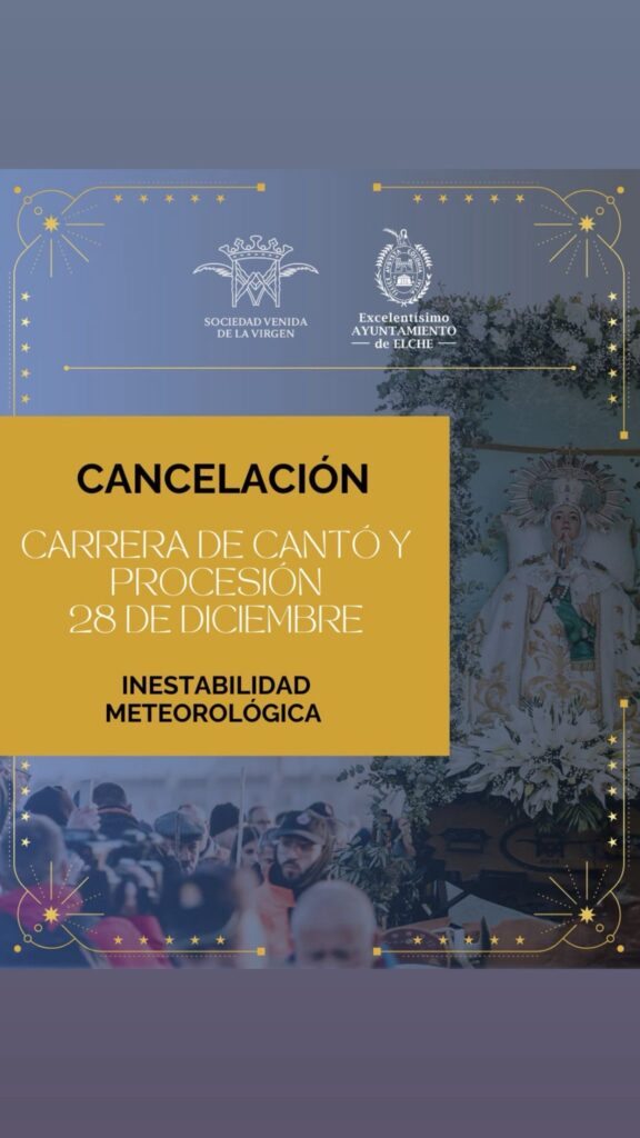 Ante la situación meteorológica prevista para esta noche y mañana, 28 de diciembre, la Sociedad Venida de la Virgen ha decidido suspender la carrera de Cantó y la posterior romería hasta el huerto. La virgen estará expuesta durante toda la mañana del domingo en el Hort de les Portes Encarnades hasta las 14h. A las […]